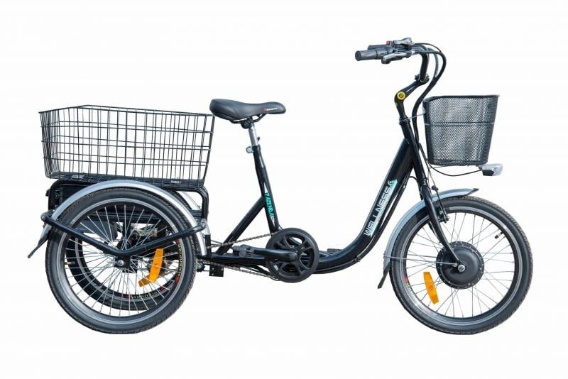 Переднеприводной трицикл или трехколесный электровелосипед. Оптимальный вариант рабочего транспорта для дачи. Оснащен уникальным механизмом, облегчающим поворот, для повышения маневренности.
